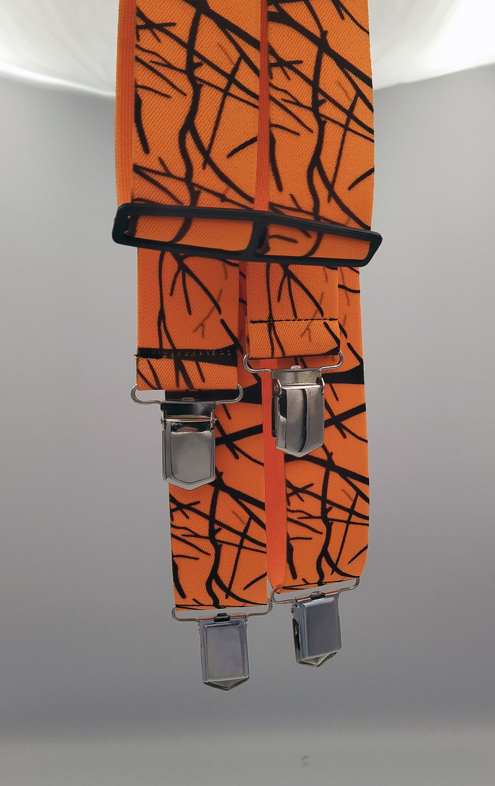Aarno-olkaimet. Risukuvioiduilla, oransseilla olkaimilla erotut metsässä. Metalliklipsit.